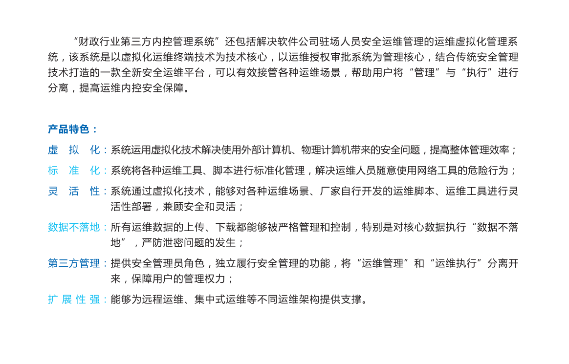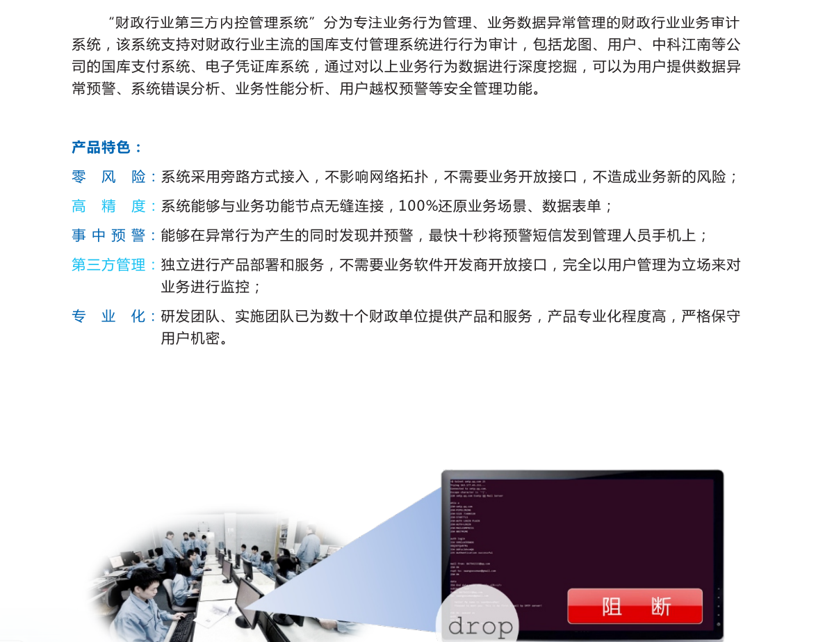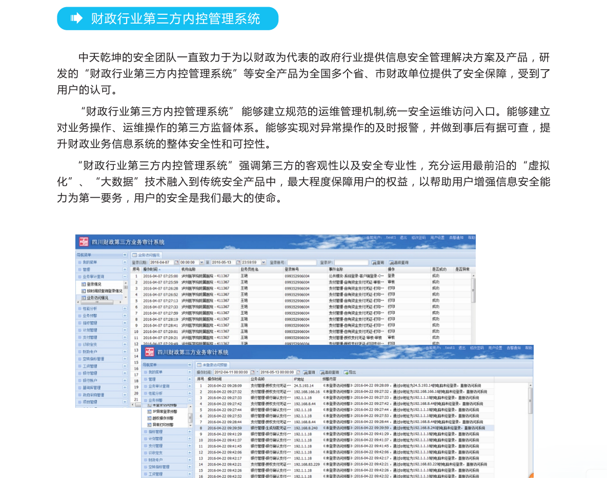 我司自主研发的第三方业务安全审计产品——鹰眼网络安全审计系统,以独有的审计抓取及分析技术,针对不同品牌的财政支付系统,在不影响系统运行的情况下能够对系统的敏感数据(金额、收款单位账号、货币单位等)进行抓取和分析,同时,该系统可针对非法操作进行不同级别的提示或告警,能够有效提高数据安全性。于2016年获得国家计算机软件著作权登记证书, 并获得公安部公共信息网络安全监督局颁发的《计算机信息系统安全专用产品销售许可证》。2017年获得成都市高新区启动基金支持,在政府扶持之下,加大技术创新力度,加快自主知识产权的技术和软件产品的研发。开发出了鹰眼智能粮库管理系统、鹰眼业务安全审计系统、鹰眼运维内控管理系统等一系列具有独立自主知识产权的产品,并取得国家计算机软件著作权登记证书。 公司自成立以来,以优质的服务获得广大客户和众多合作伙伴的信任和认可!目前已累计进行 8个省级财政厅、18 个地市财政局的项目开发和实施,产品获得用户一致认可和高度评价,与客户建立了良好的合作关系。